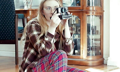 Super-steamy blonde in glasses Gracie takes off her clothes and shows off her vulva