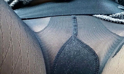 Cream is flowing out through the sheer pantyhose! Soaked wet stocking and wet sticky poon