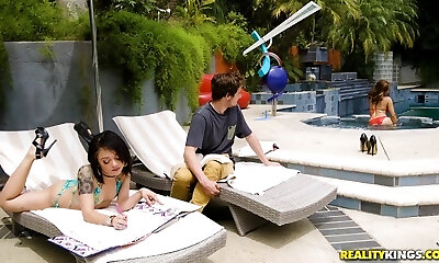 Fellow gets blown and fucks horny girlfriends by pool
